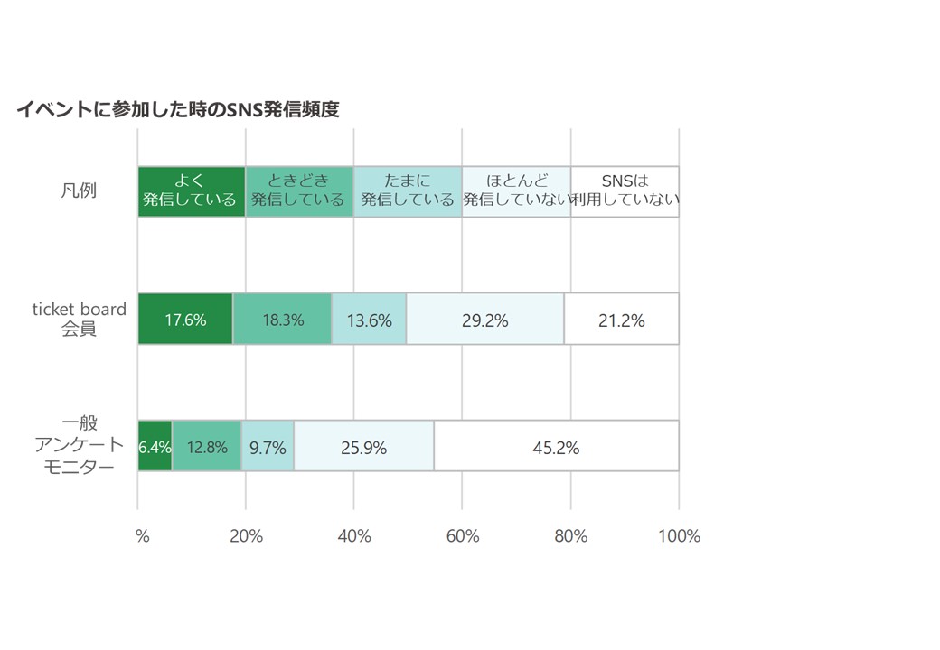 ticket board会員はSNSを利用している割合が一般アンケートモニターに比べて高く、 特に、 参加したイベントについてSNSで「よく発信している」と回答した割合が、 一般アンケートモニターを大きく上回っていました。