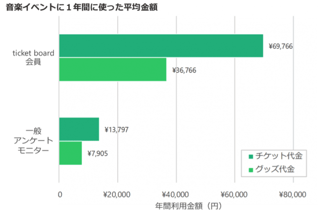 ticket board会員は平均で音楽イベントに年間10万円以上(チケット7.0万円、 グッズ:3.7万円)使っており、 一般アンケートモニターに比べ非常に多くのお金を使っていることが確認できました。