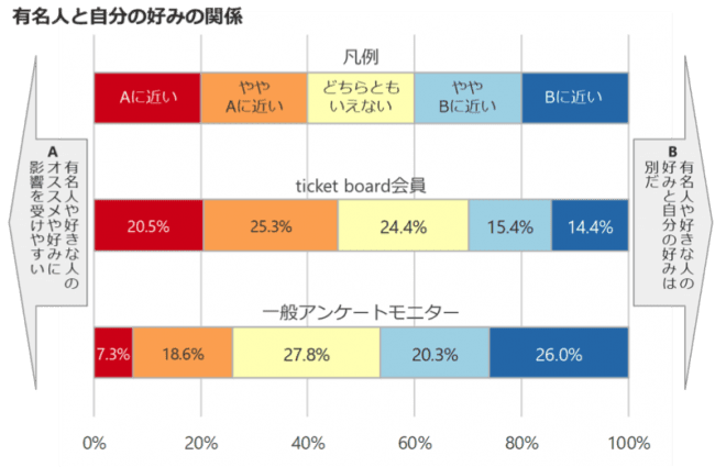 一般アンケートモニターでは、 有名人や好きな人の好みと自分の好みは別だとする人が多数派ですが、 ticket board会員では、 有名人や好きな人のオススメや好みに影響を受けやすい人の方が多数派でした。