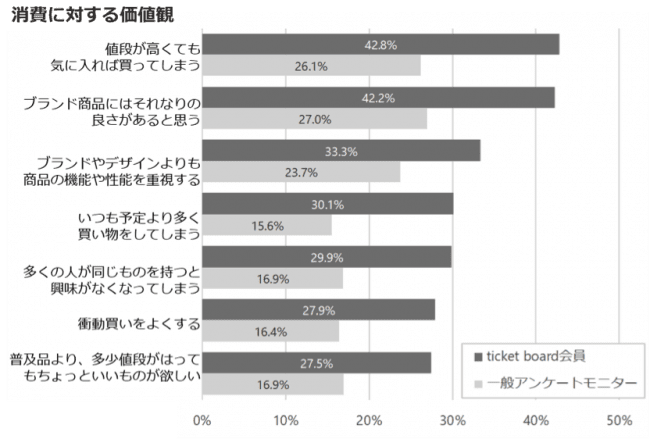 ticket board会員は一般アンケートモニターに比べ、 「価格よりも自分の評価を重視する」傾向が強く、 また「衝動買いを良くする」ため、 消費に積極的といえます。 一方で、 「ブランド商品にはそれなりの良さがある」とブランドの価値を認めつつも、 「機能や性能を重視する」「多くの人が同じものを持つと興味がなくなる」という回答の割合も高く、 商品やサービスの見極めにこだわる人ともいえます。