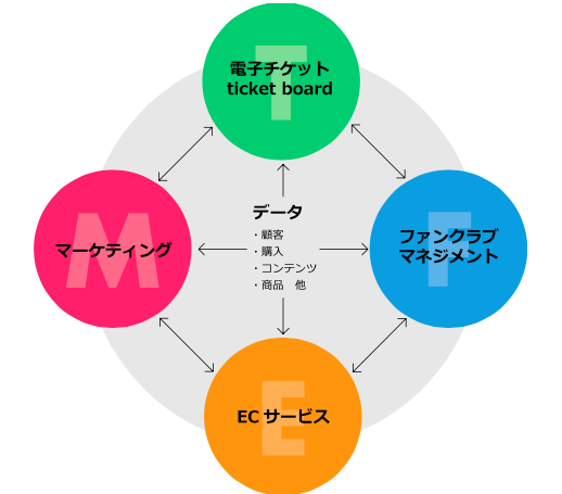 「カタチにこだわらないエンタテインメントの楽しさを提供し、ひとりひとりの感動の最大化を目指す」を企業理念に、国内最大の電子チケットサービス“ticket board” の運営の他、デジタルコンテンツ及びグッズ等の企画制作や、ファンクラブ及びファンクラブイベントの企画・提案、会報の制作なども手がけています。