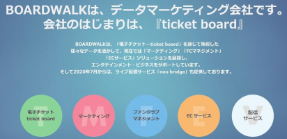 「カタチにこだわらないエンタテインメントの楽しさを提供し、ひとりひとりの感動の最大化を目指す」を企業理念に、国内最大の電子チケットサービス“ticket board” の運営の他、デジタルコンテンツ配信及びグッズ等の企画制作や、ファンクラブ及びファンクラブイベントの企画・提案、会報の制作なども手がけています。